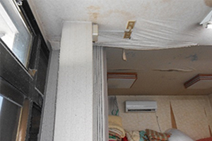 左の写真は、室内天井へ雨シミが発生しております。雨漏りは屋根や外壁から侵入しますが、居住空間である室内に雨シミが発生してこない限り、発見するというのはなかなか難しいのです。しかし、ほおっておくと室内も痛めてしまい、最後は建物の主要な構造体を腐らせてしまいます。雨シミや雨水の侵入を発見したら手遅れになる前に、いつでもご相談ください。